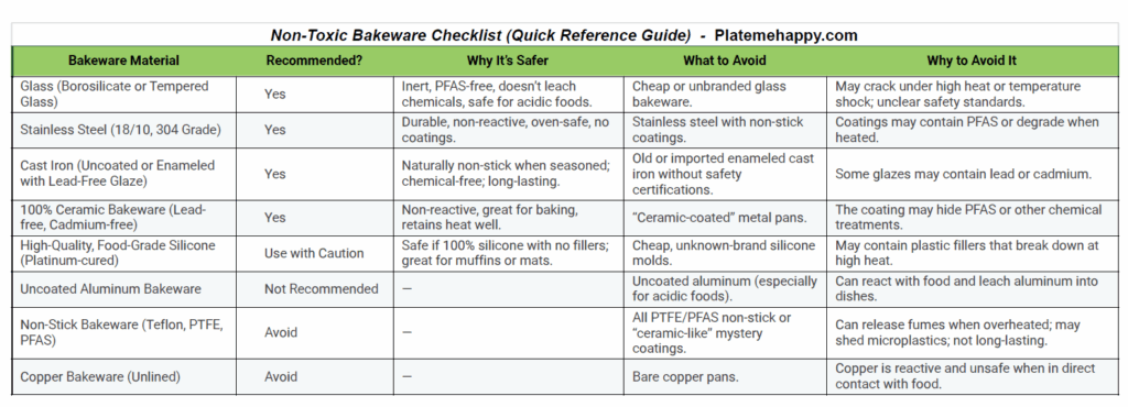 When I rebuilt my kitchen bakeware set, I focused on materials that are inert, non-reactive, and free from harmful coatings. These are the safest options: