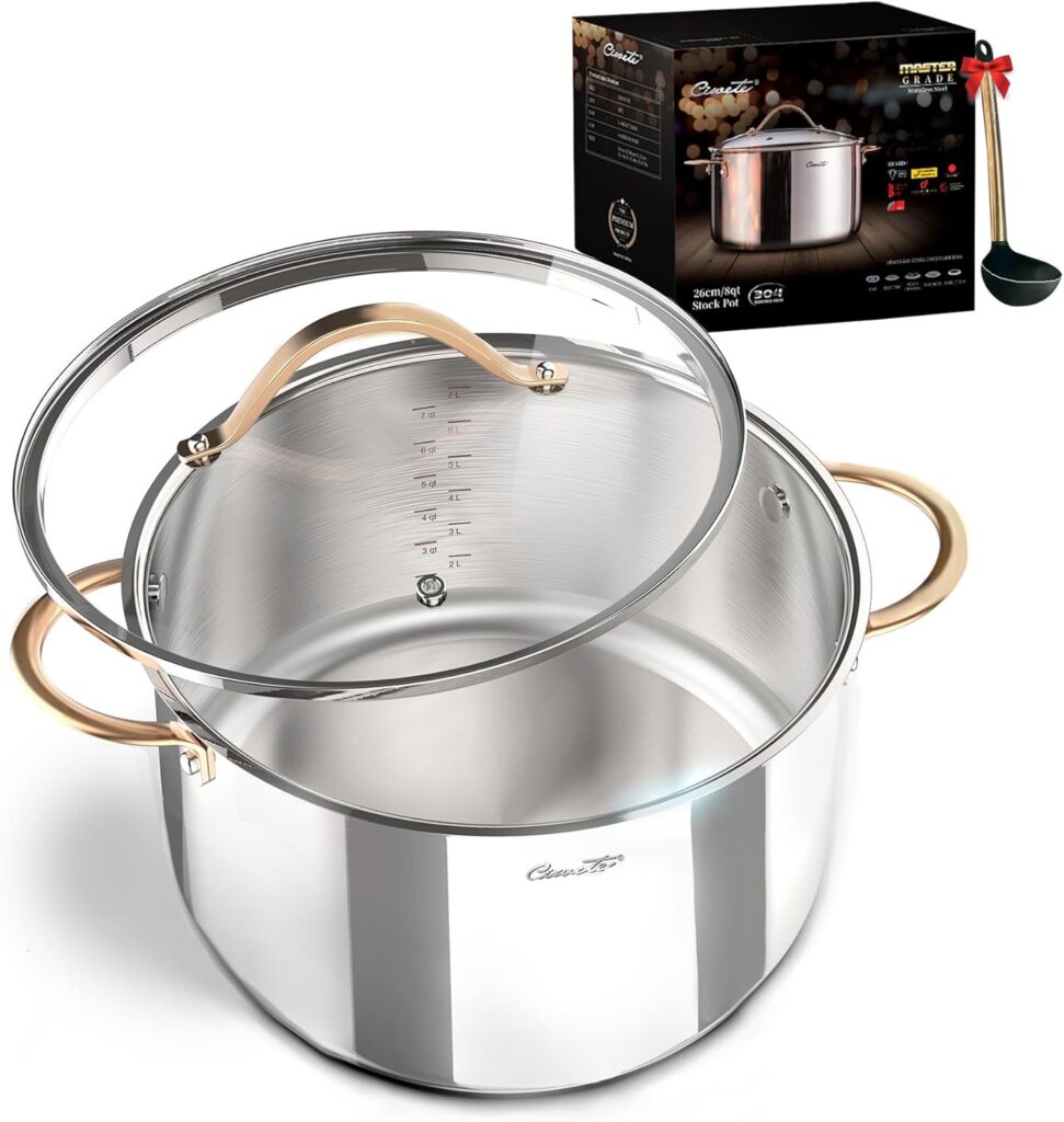 Healthy & Versatile Cooking: 8-quart pot with food-grade 18/10 stainless steel interior, ideal for soups, seafood, slow simmering, and everyday meals.
